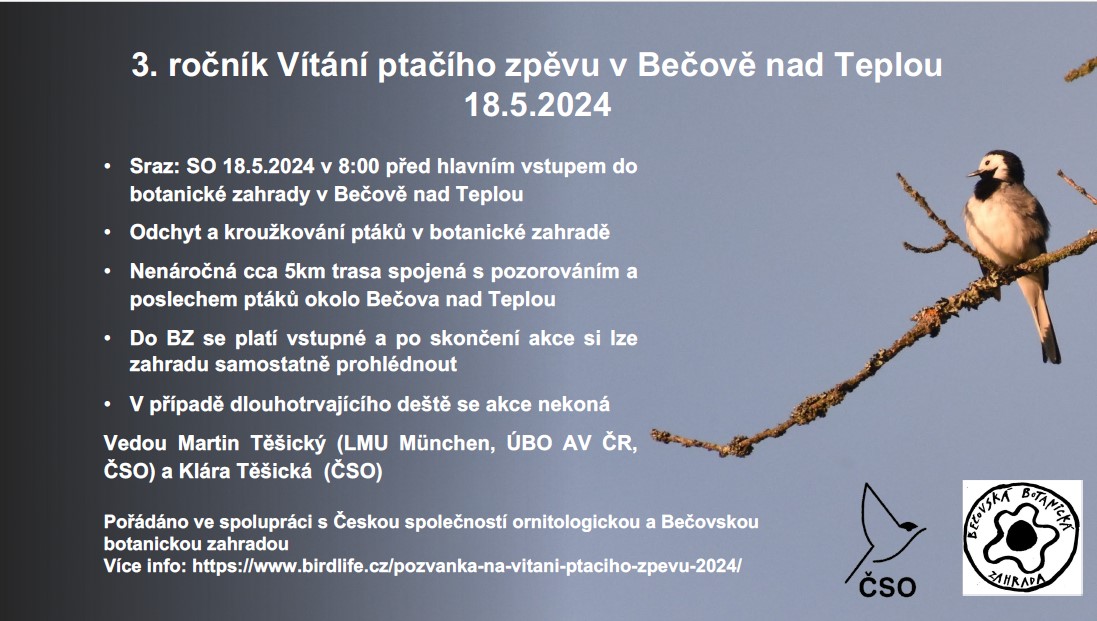 Poznámka: V případě silného dlouhotrvajícího deště se akce nekoná.  Pokud vlastníte, vezměte si s sebou dalekohled nebo atlas ptáků. Můžete si také do mobilního telefonu dopředu nainstalovat aplikace BirdNet či Merlin na určování ptačích hlasů. Do botanické zahrady se platí vstupné. Po skončení exkurze si návštěvníci mohou botanickou zahradu samostatně prohlédnout i se zde případně občerstvit. Pořádáno ve spolupráci s Českou společností ornitologickou a Botanickou zahradou v Bečově nad Teplou.